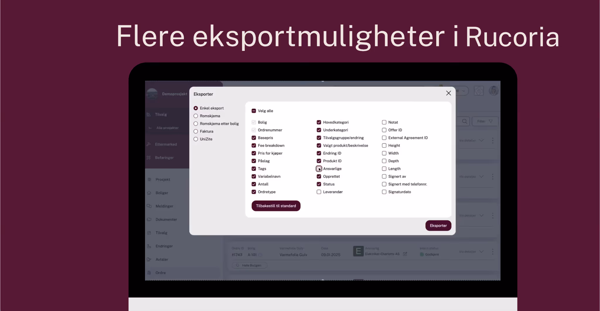 Eksport til Excel er en av de mest populære funksjonene i Rucoria, og gjør det enkelt å bearbeide informasjon videre. Enten du trenger å eksportere romskjema, underlag for materiell-bestillinger eller fakturagrunnlag, har du alltid tilgang til oppdatert data på ett sted. Vi har nå forbedret eksportfunksjonen ytterligere, med flere valgmuligheter og enda større fleksibilitet.Uansett om du er underentreprenør, totalentreprenør eller utbygger, har alle tilgang til den samme oppdaterte informasjonen og kan eksportere det de trenger – raskt og enkelt Med Rucoria sparer du tid og reduserer risikoen for feil 🍇