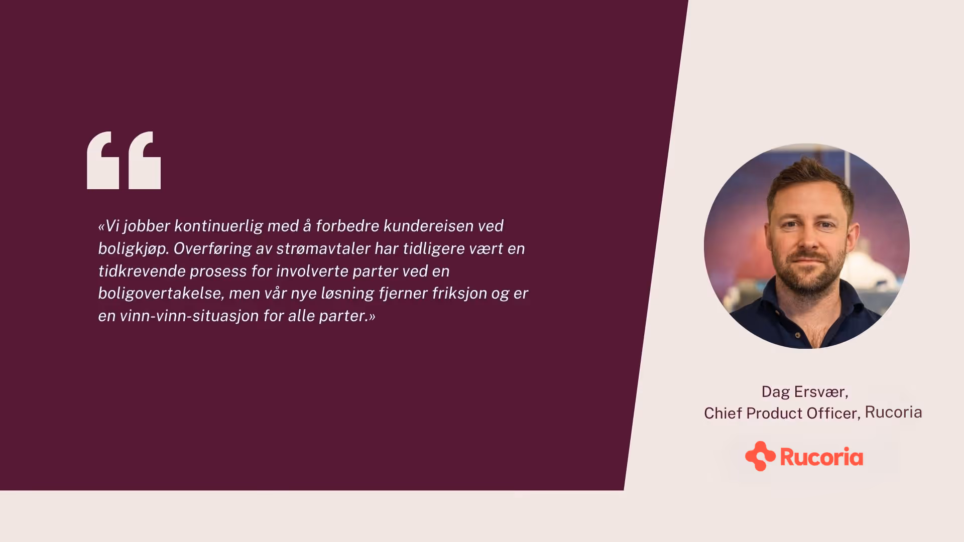 Dag Ersvær, Chief Product Officer i Rucoria, er stolt av løsningen og de gode resultatene: «Vi jobber kontinuerlig med å forbedre kundereisen ved boligkjøp. Overføring av strømavtaler har tidligere vært en tidkrevende prosess for involverte parter ved en boligovertakelse, men vår nye løsning fjerner friksjon og er en vinn-vinn-situasjon for alle parter.»